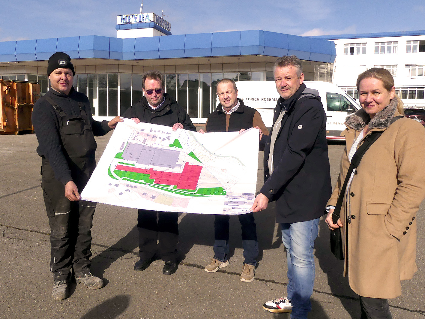 Kalletal-Kalldorf (rr). Dem verwaisten Meyra-Gelände in Kalldorf wird wieder neues Leben eingehaucht. Das wurde bei einer Begehung am Mittwochmittag klar, als sich Bauherr, Architekt, Baufirma und Verwaltung auf dem weitläufigen Parkplatz trafen und Dipl.-Ing Arnd Steinleger einen großen Plan entfaltete. Die Investitionssumme beträgt rund 20 Millionen Euro. Bürgermeister Mario Hecker