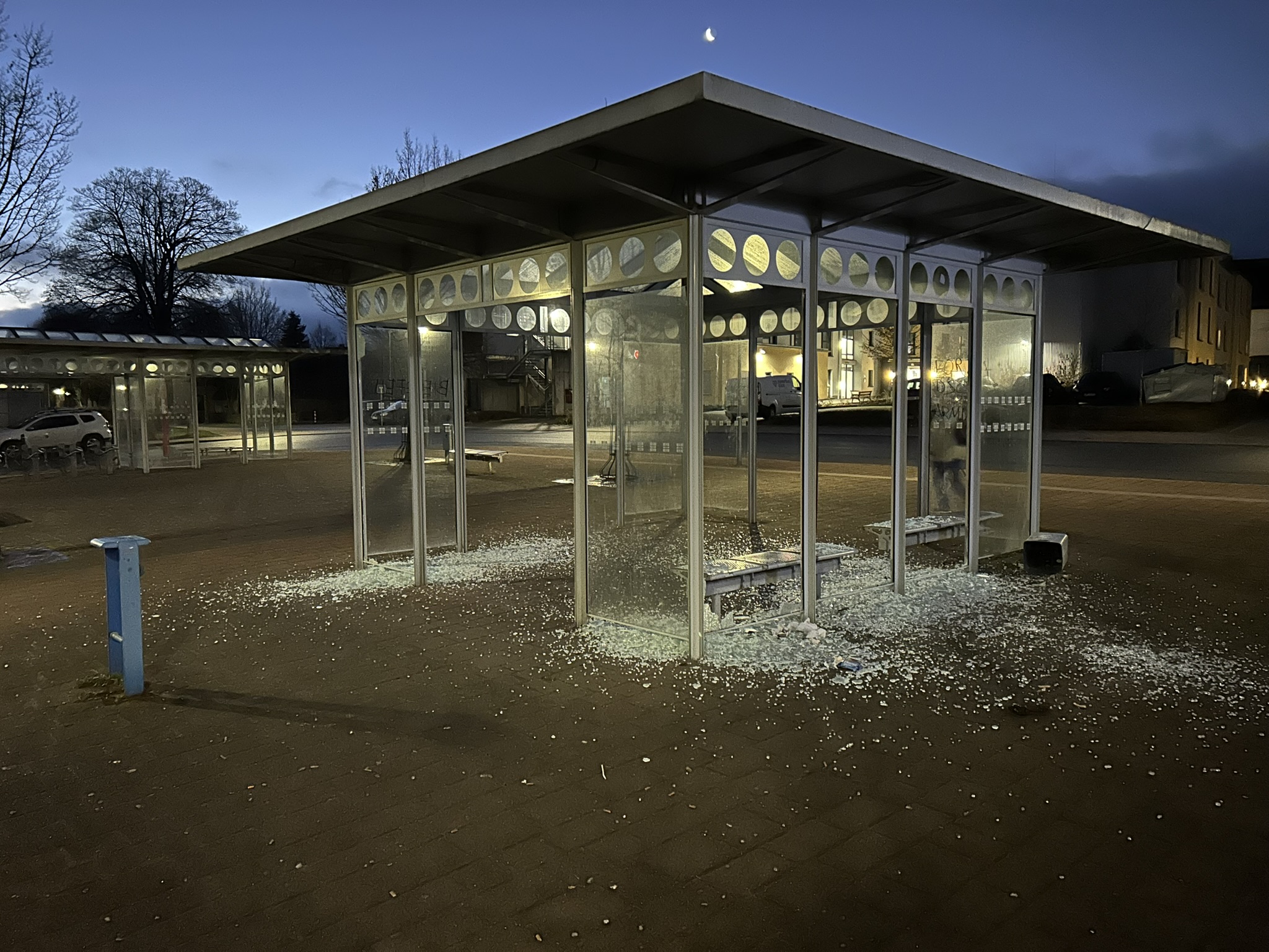 Was im Sommer mit den Verkehrszeichen begann, hat sich allerdings inzwischen zu einer anhaltenden und gezielten Zerstörung öffentlichen Eigentums entwickelt. Nach dem gleichen Muster wurden die Seitenwände der Wartehäuser am Busbahnhof beschmiert. Darüber hinaus wurde ein öffentlicher Müllbehälter zweckentfremdet und als Tatmittel genutzt, um vier weitere Seitenwände mutwillig einzuschlagen.