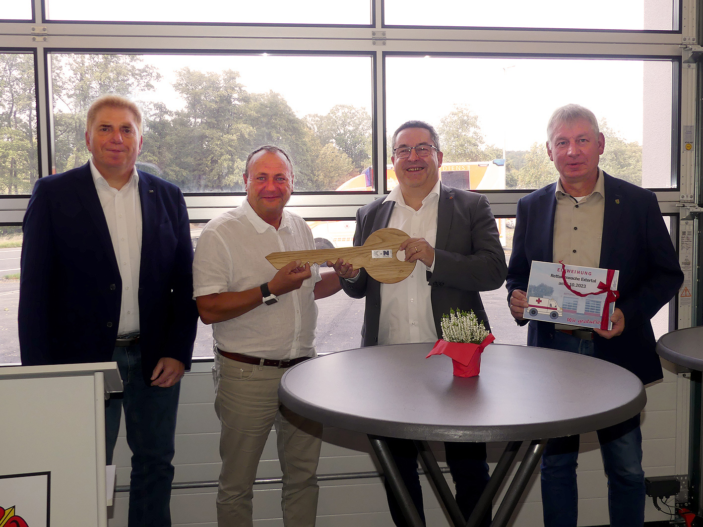 Lehmann hatte sich, neben Sven Oehlmann, dem Geschäftsführer der vbe-Unternehmensgruppe, Bürgermeister Frank Meier, Geschäftsführer Dietmar Nunne von der Baufirma Kögel + Nunne sowie zahlreichen Vertretern des Rettungsdienstes und der Feuerwehr zur Übergabe der neuen Rettungswache in dem schmucken Neubau in Bösingfeld eingefunden. Dieser ersetzt die provisorische Rettungswache, die Anfang 2018 in den Hallen des Bauhofs in Extertal in Betrieb gegangen war.